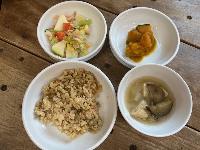 ❖鶏ごぼうごはん ❖じゃがいものオーブン焼き ❖キャベツと鮭のサラダ ❖豚汁 10月のお献立表を見る