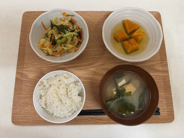 ❖ごはん ❖魚の煮付け 付け合わせ 小松菜 ❖キャベツと根菜のサラダ ❖さつまいものみそ汁