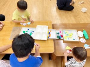 好きな形の色画用紙に絵を描いたり、のりではりつけたりして飾りを作りました。