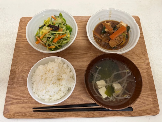 ❖ごはん ❖魚の煮付け 付け合わせ 小松菜 ❖キャベツと根菜のサラダ ❖さつまいものみそ汁