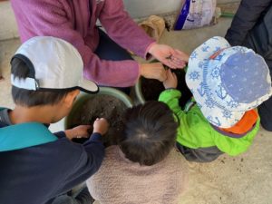 今回植える野菜は水菜。小さい種なので、地面に落とさないように、そっと手のひらに包んで、鉢まで運ぶ子ども達。