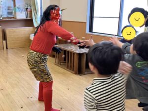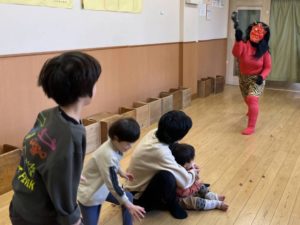 読み終わって、節分のお話をしたのち、いよいよ豆まきの説明をします。これから何が起きるのか予測がつき、徐々に表情が曇っていくみんな・・・