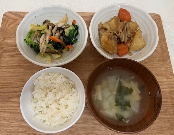 ❖ごはん ❖魚の煮付け 付け合わせ 小松菜 ❖キャベツと根菜のサラダ ❖さつまいものみそ汁