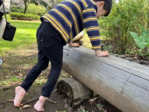 ある子は、裸足で芝生の上を歩いたり、ベンチの上であぐらになって景色を眺めたりと、のんびりとした時間の中で体を動かすことが出来ました🌼