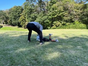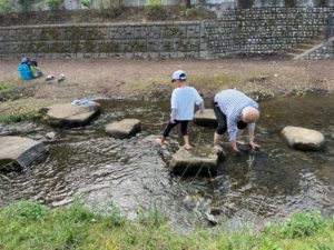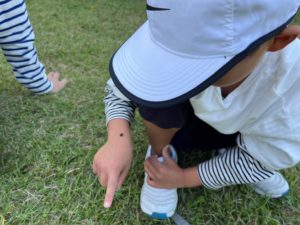 目的地に向かいながら、途中で川あそびや葉っぱあそび、芝生で職員とお相撲ごっこなど、