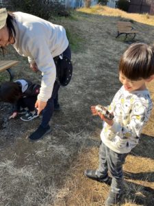ザクザクと足で踏んで感触を楽しんだり、大きな塊を手に持ってみたり。
