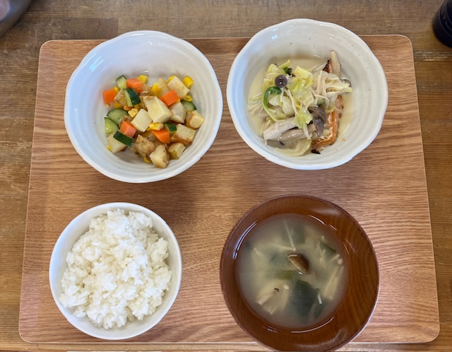 ❖ごはん ❖魚の煮付け 付け合わせ 小松菜 ❖キャベツと根菜のサラダ ❖さつまいものみそ汁