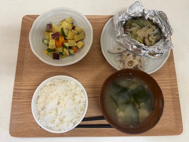 ❖ごはん ❖魚の煮付け 付け合わせ 小松菜 ❖キャベツと根菜のサラダ ❖さつまいものみそ汁