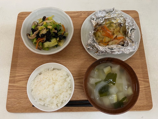 ❖ごはん ❖魚の煮付け 付け合わせ 小松菜 ❖キャベツと根菜のサラダ ❖さつまいものみそ汁