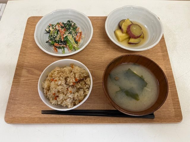 ❖ごはん ❖魚の煮付け 付け合わせ 小松菜 ❖キャベツと根菜のサラダ ❖さつまいものみそ汁