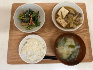 ❖ごはん ❖魚の煮付け 付け合わせ 小松菜 ❖キャベツと根菜のサラダ ❖さつまいものみそ汁