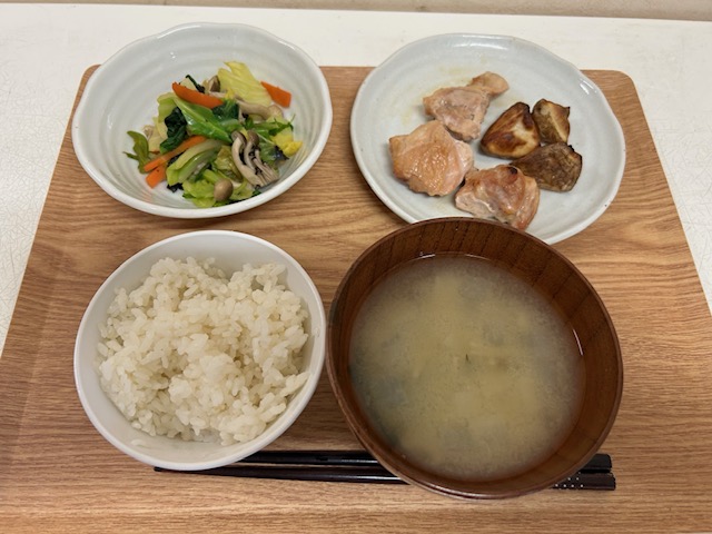 ❖ごはん ❖魚の煮付け 付け合わせ 小松菜 ❖キャベツと根菜のサラダ ❖さつまいものみそ汁