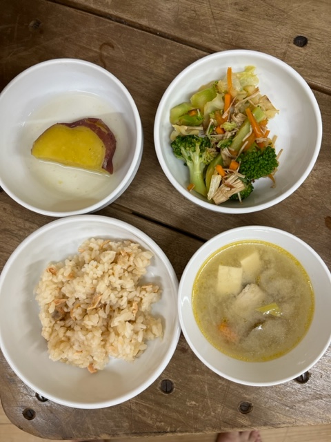 ❖鮭ごはん ❖さつまいもの甘煮 ❖ブロッコリーのおかか和え ❖鶏汁