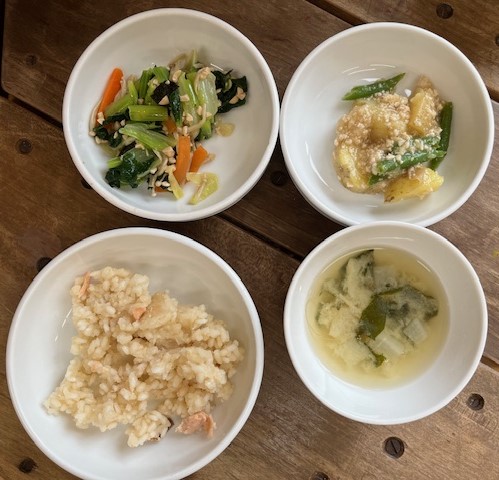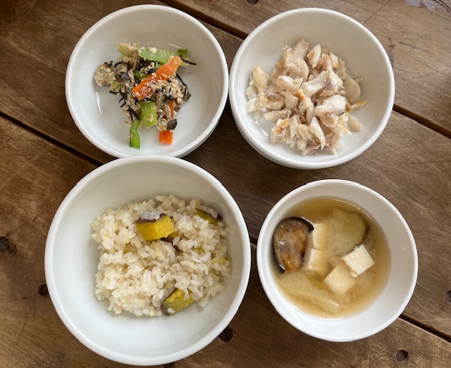 ❖さつまいもごはん ❖魚の干物 ❖キャベツの中華和え ❖焼きなすのみそ汁