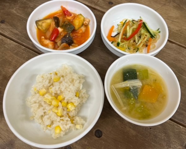 ❖とうもろこしごはん ❖鶏肉と夏野菜のトマト煮 ❖春雨サラダ ❖かぼちゃのみそ汁