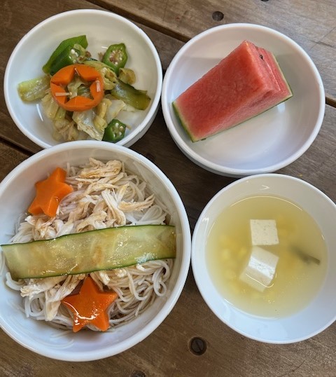 ❖七夕そうめん冷やし中華風 ❖おくらのおかか和え ❖とうもろこしのスープ ❖すいか