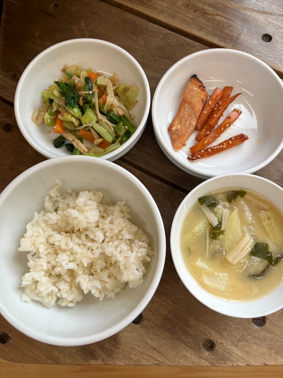 ❖ごはん ❖魚の照り焼き ❖にんじんの塩きんぴら ❖キャベツのおかか和え ❖じゃがいものみそ汁