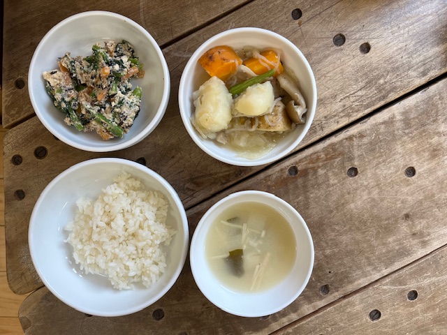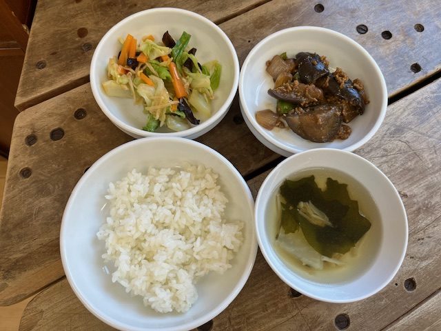 ❖ごはん ❖なすのみそ炒め ❖キャベツの中華和え ❖大根スープ