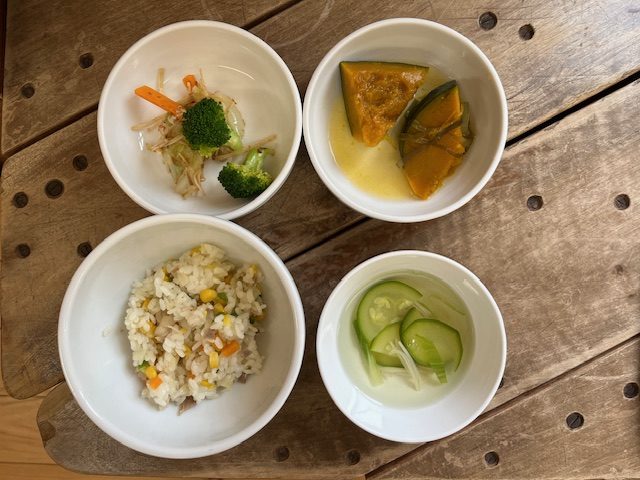 ❖豚肉ととうもろこしのピラフ ❖かぼちゃの煮物 ❖ブロッコリーのおかか和え ❖ズッキーニのスープ