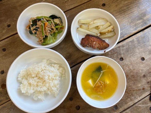 ❖ごはん ❖魚のごま焼き ❖じゃがいもの塩炒め ❖小松菜の納豆和え ❖かぼちゃのみそ汁