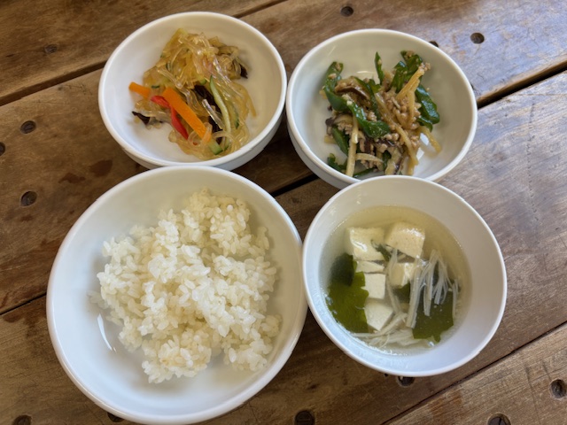 ❖ごはん ❖ピーマンと豚ひき肉の炒め物 ❖春雨サラダ ❖豆腐のスープ