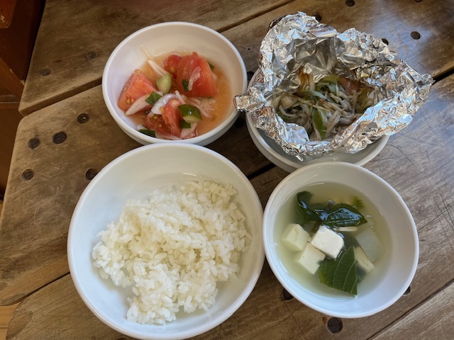 ❖ごはん ❖魚のホイル焼き ❖トマトサラダ ❖モロヘイヤのスープ