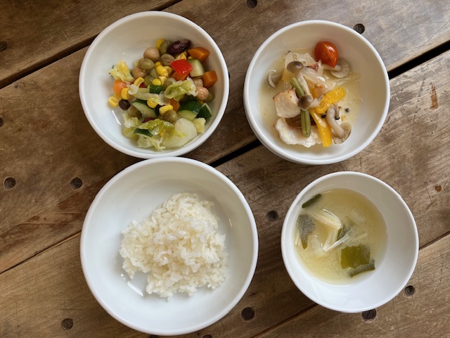 ❖ごはん ❖魚のアクアパッツァ風 ❖お豆のサラダ ❖じゃがいものみそ汁