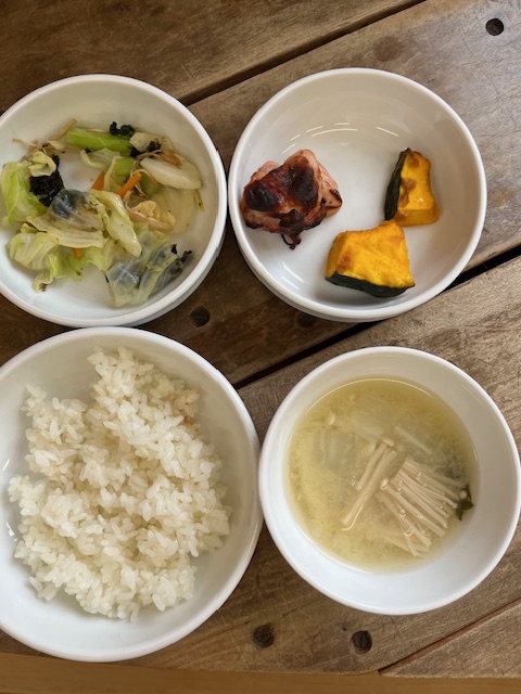 ❖ごはん ❖鶏肉のみそ焼き ❖かぼちゃのオーブン焼き ❖キャベツの磯和え ❖大根のみそ汁