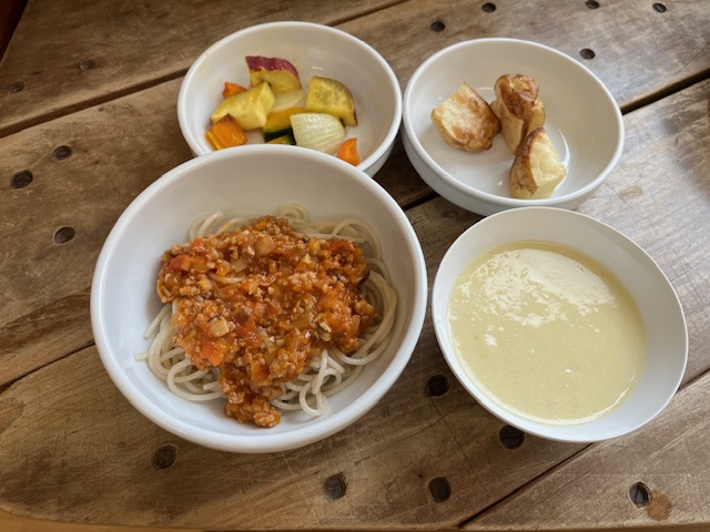 ❖ミートソーススパゲティ(グルテンフリー) ❖じゃがいものオーブン焼き ❖焼き野菜のマリネ ❖コーンポタージュスープ