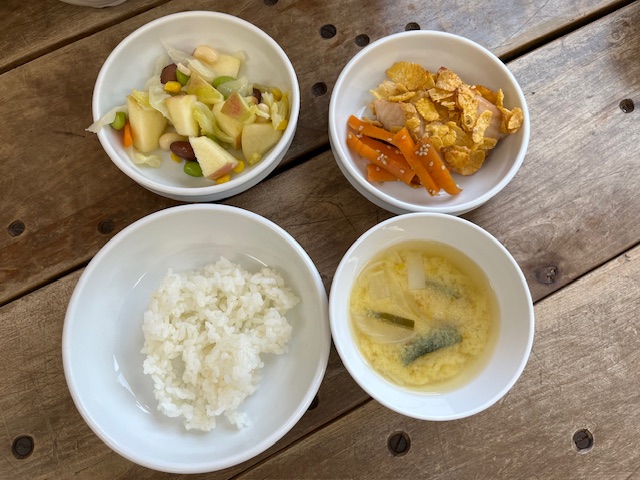 ❖ごはん ❖魚のコーンフレーク焼き ❖にんじん塩きんぴら ❖お豆のサラダ ❖かぼちゃのみそ汁