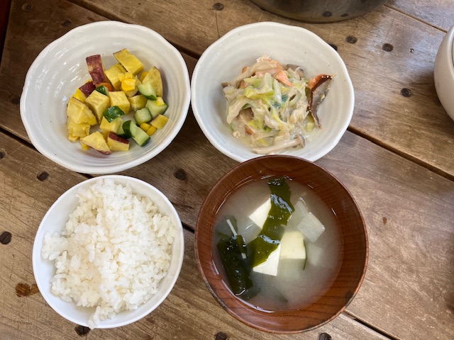 ❖ごはん ❖魚の煮付け ❖付け合わせ小松菜 ❖さつまいのもサラダ ❖トロトロ納豆汁