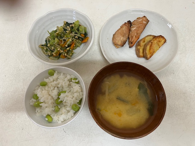 ❖枝豆ごはん ❖魚の照り焼き ❖じゃがいものオーブン焼き ❖小松菜の納豆和え ❖かぼちゃのみそ汁