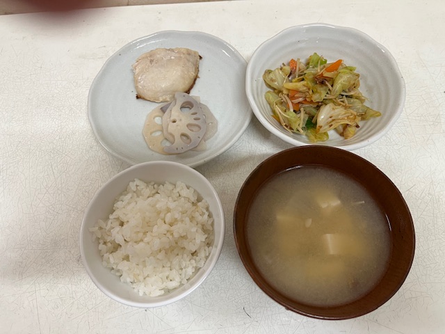 ❖ごはん ❖魚のみそ焼き ❖れんこんの塩炒め ❖キャベツのおかか和え ❖きのこのみそ汁