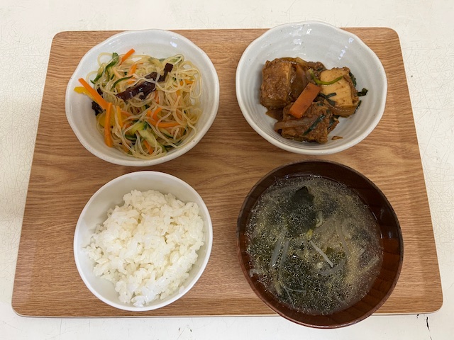 ❖ごはん ❖厚揚げのみそ炒め ❖春雨サラダ ❖もやしのスープ