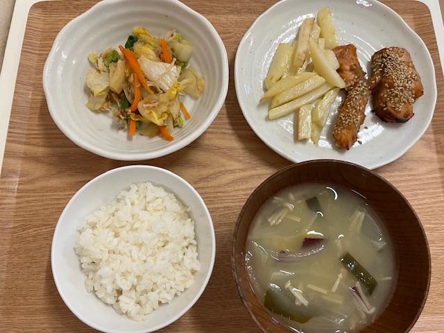 ❖ごはん ❖鶏肉のみそ焼き ❖きんぴらごぼう ❖キャベツの磯和え ❖じゃがいものみそ汁