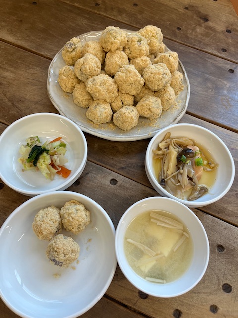 ❖さつまいもごはんお月見だんご風 ❖魚のきのこあんかけ ❖キャベツのおかか和え ❖豆腐のみそ汁