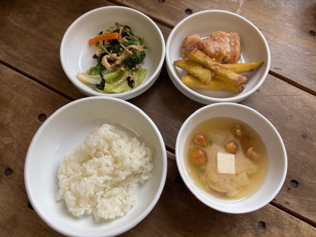 ❖ごはん ❖鶏肉のみそ焼き ❖さつまいものきんぴら ❖小松菜の納豆和え ❖きのこのみそ汁
