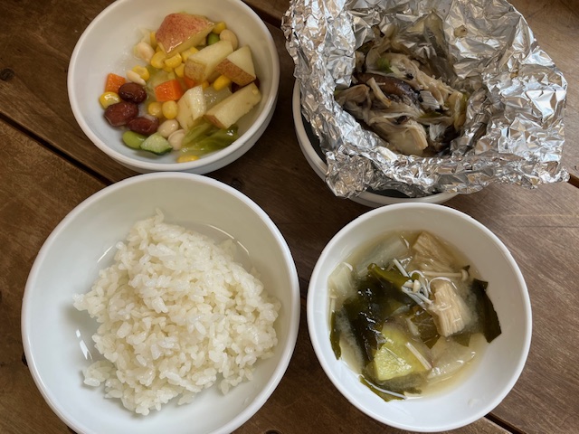 ❖ごはん ❖魚のホイル焼き ❖お豆のサラダ ❖さつまいものみそ汁