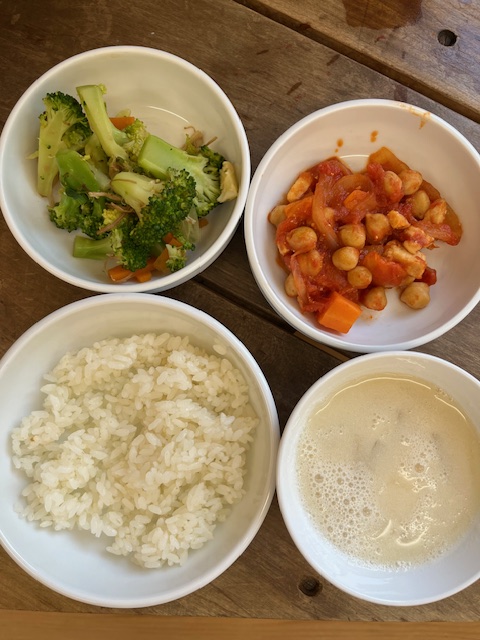 ❖ごはん ❖鶏肉とひよこ豆のトマト煮 ❖ブロッコリーのおかか和え ❖呉汁