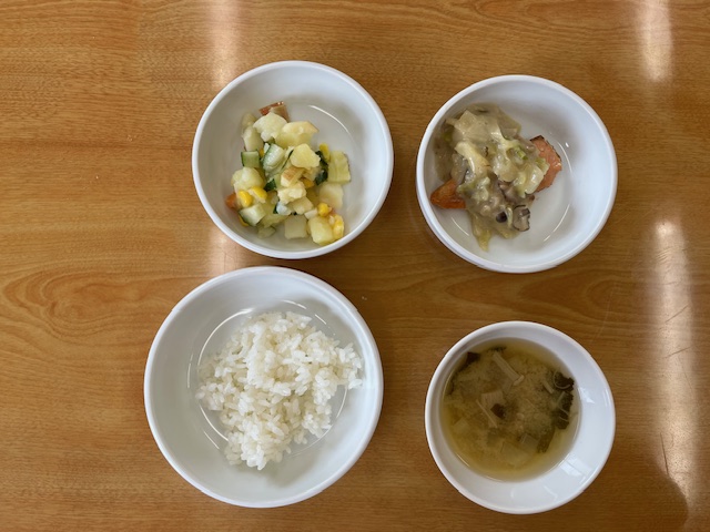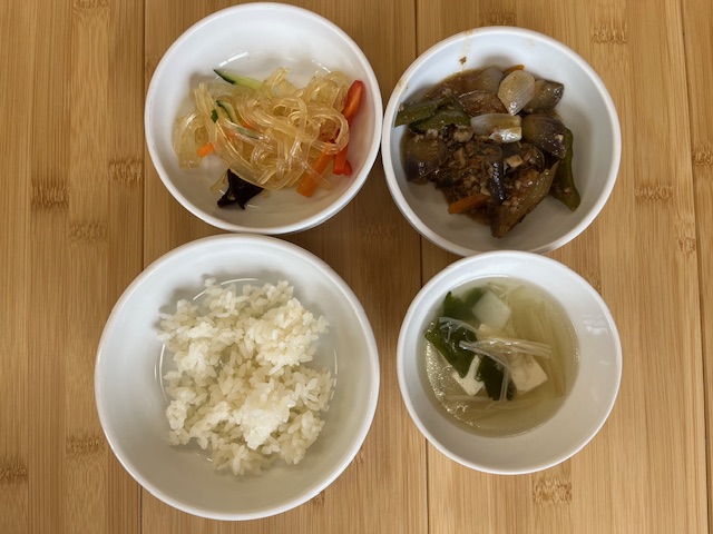 ❖ごはん ❖なすのみそ炒め ❖春雨サラダ ❖豆腐のスープ