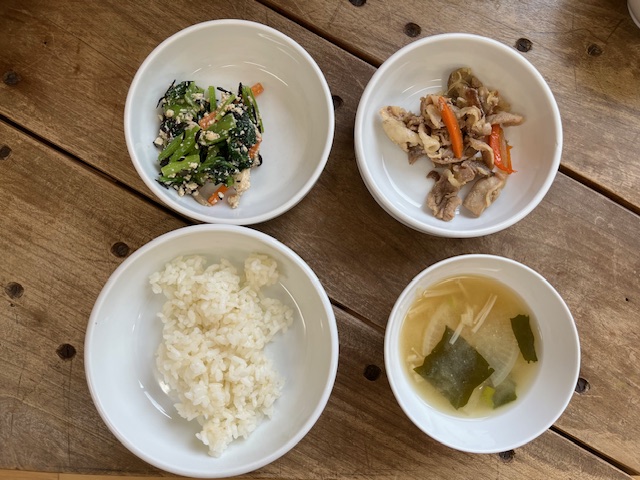 ❖ごはん ❖豚の生姜焼き ❖小松菜とひじきの白和え ❖大根のみそ汁
