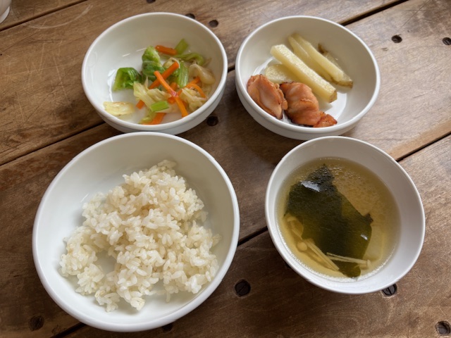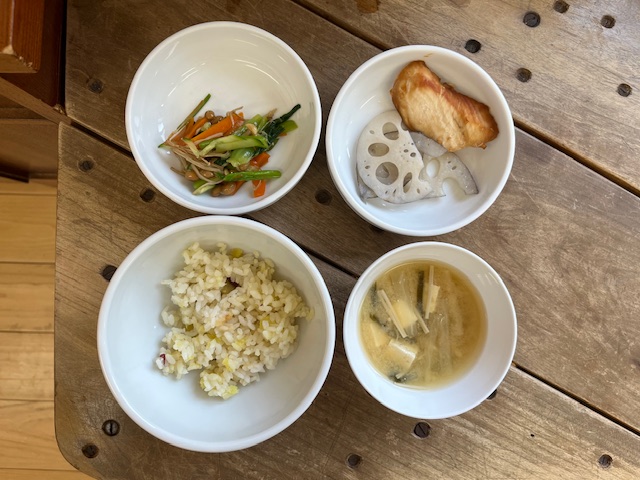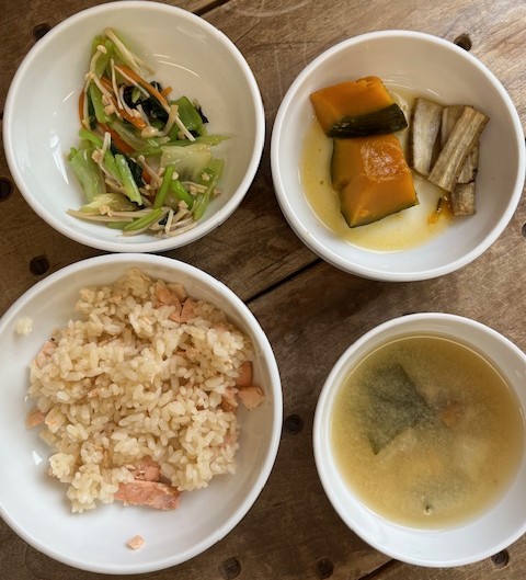 ❖鮭ごはん ❖かぼちゃの煮物 ❖ごぼうのオーブン焼き ❖小松菜の納豆和え ❖きのこのみそ汁 ※食材の都合により、メニューを変更しました。