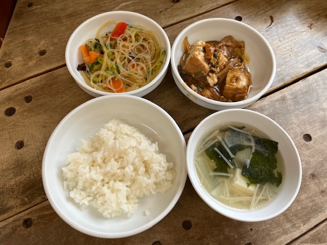❖ごはん ❖厚あげのみそ炒め ❖春雨サラダ ❖大根のスープ